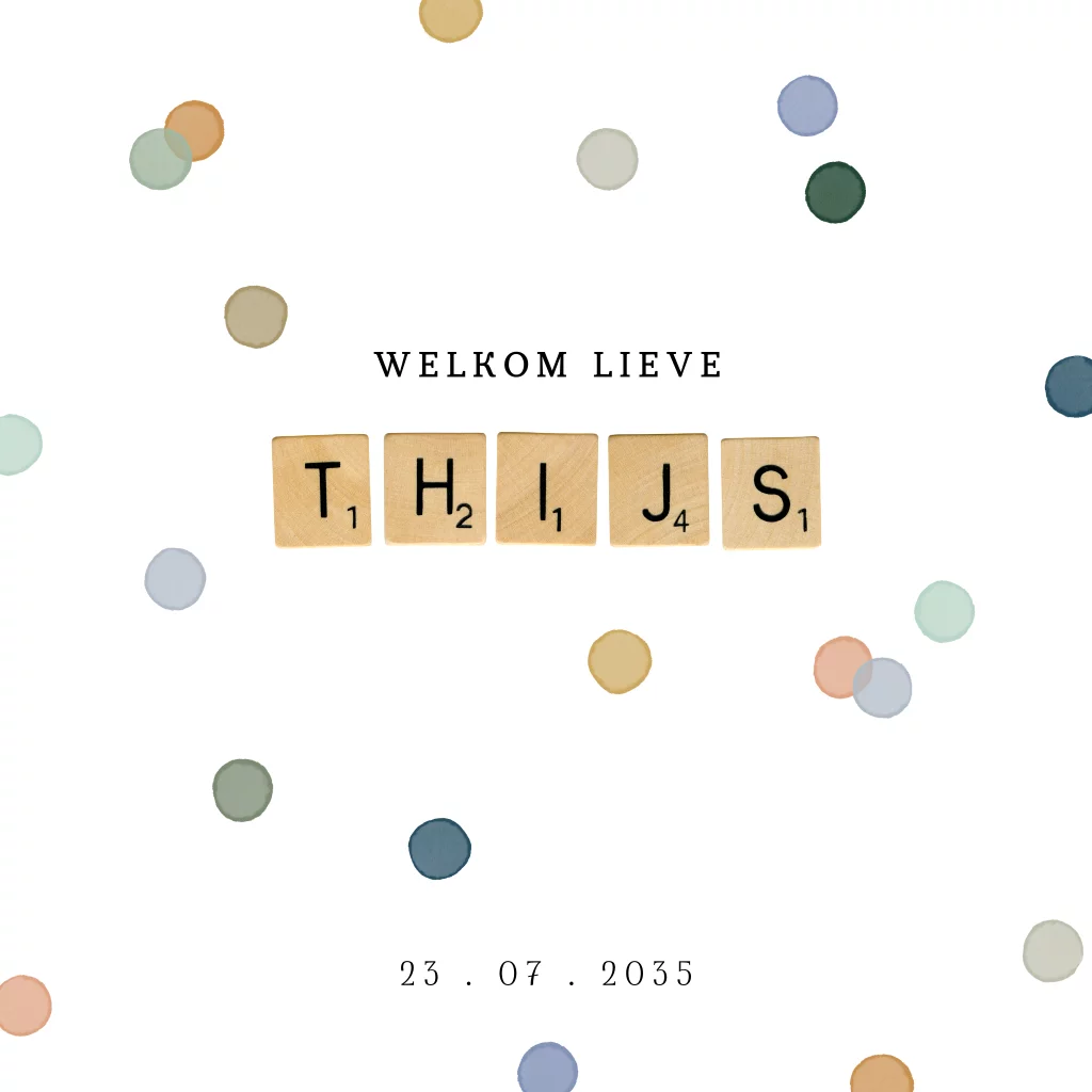 Vrolijk genderneutraal confetti geboortekaartje met scrabble letters.
