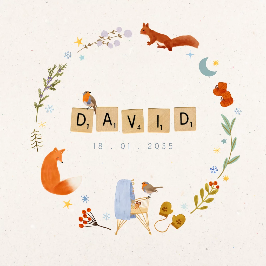 Winters geboortekaartje met een wiegje, takjes en dieren