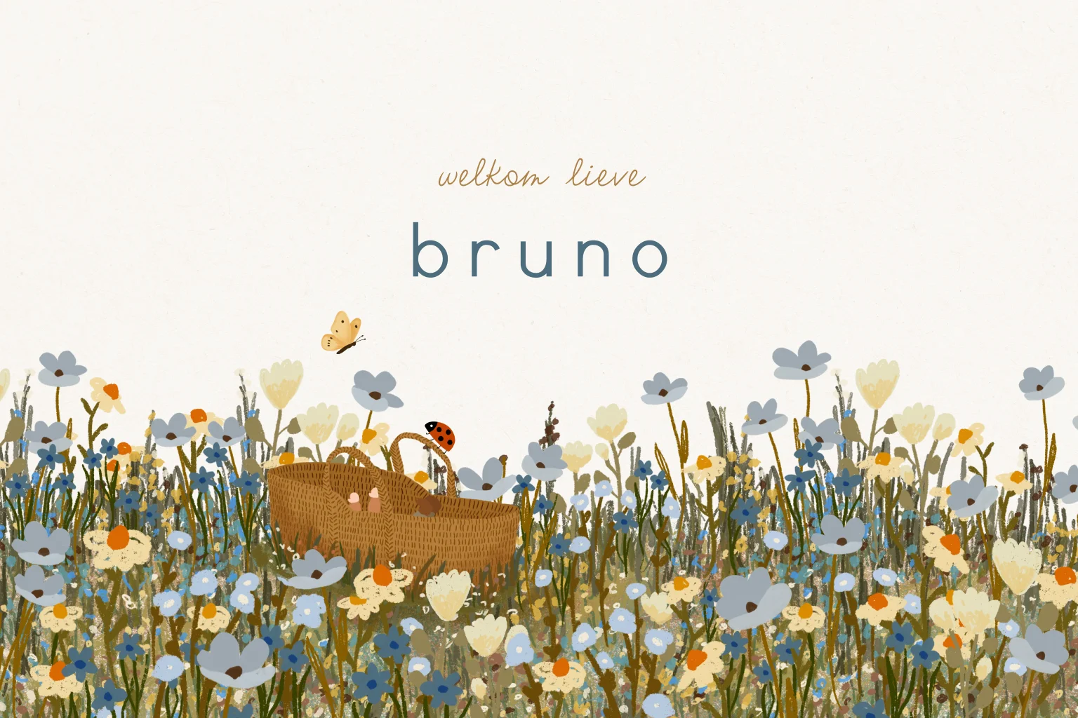 Dit liggende geboortekaartje met een winters bloemenveld, een reiswiegje met een baby'tje, een lieveheersbeestje en een vlinder is een echte eyecatcher.