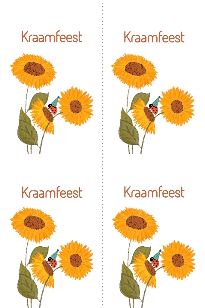 DIY kraamfeest kaartjes met zonnebloemen en een feest-lieveheersbeestje - heb je het feesthoedje gezien dat hij op heeft?.