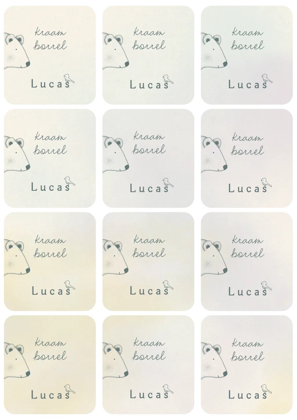 Twaalf kraamborrelkaartjes met een lijntekening van een grote vriendelijke beer en vogeltjes.