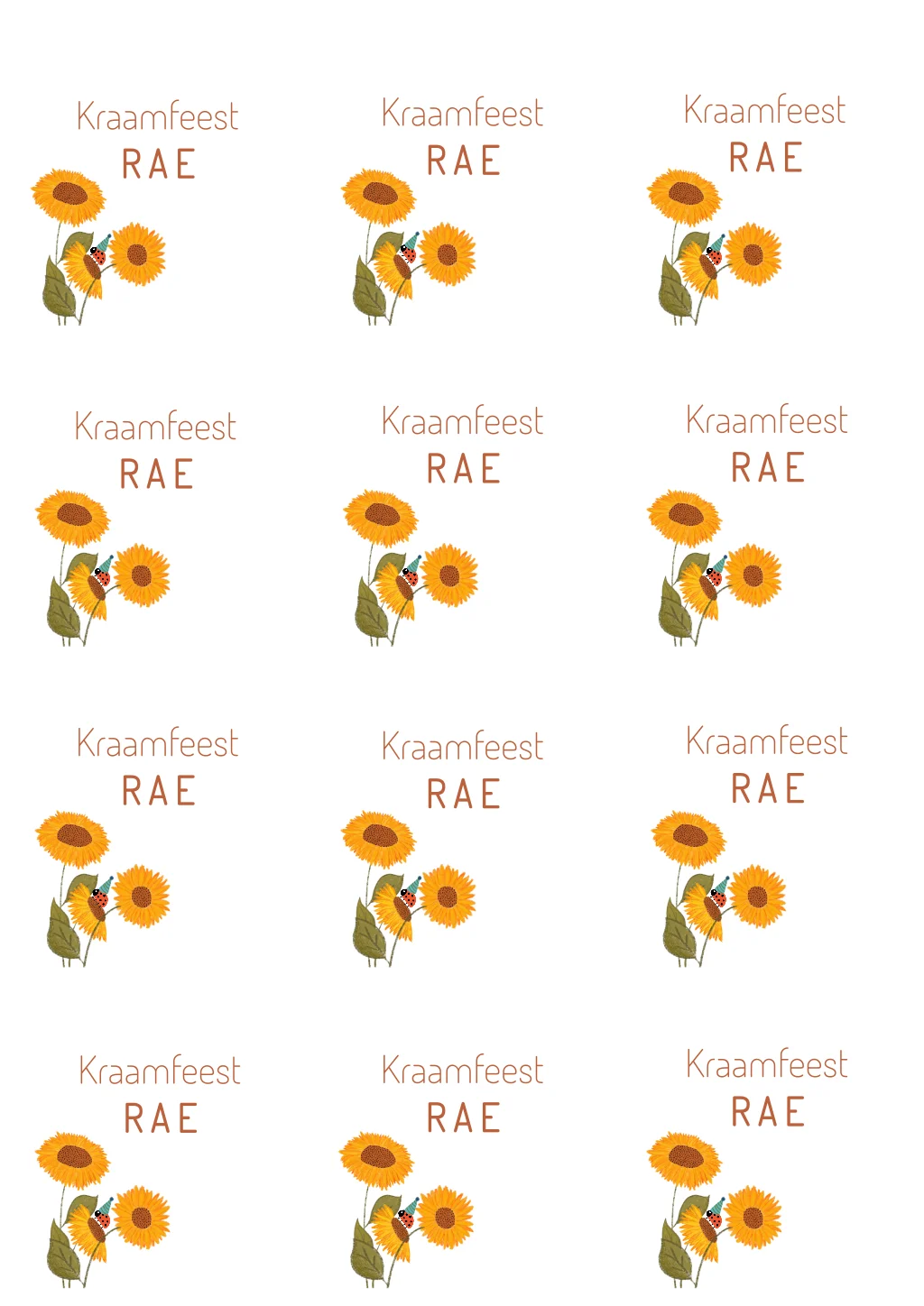 Twaalf kraamborrelkaartjes met zonnebloemen en een feestelijk lieveheersbeestje.