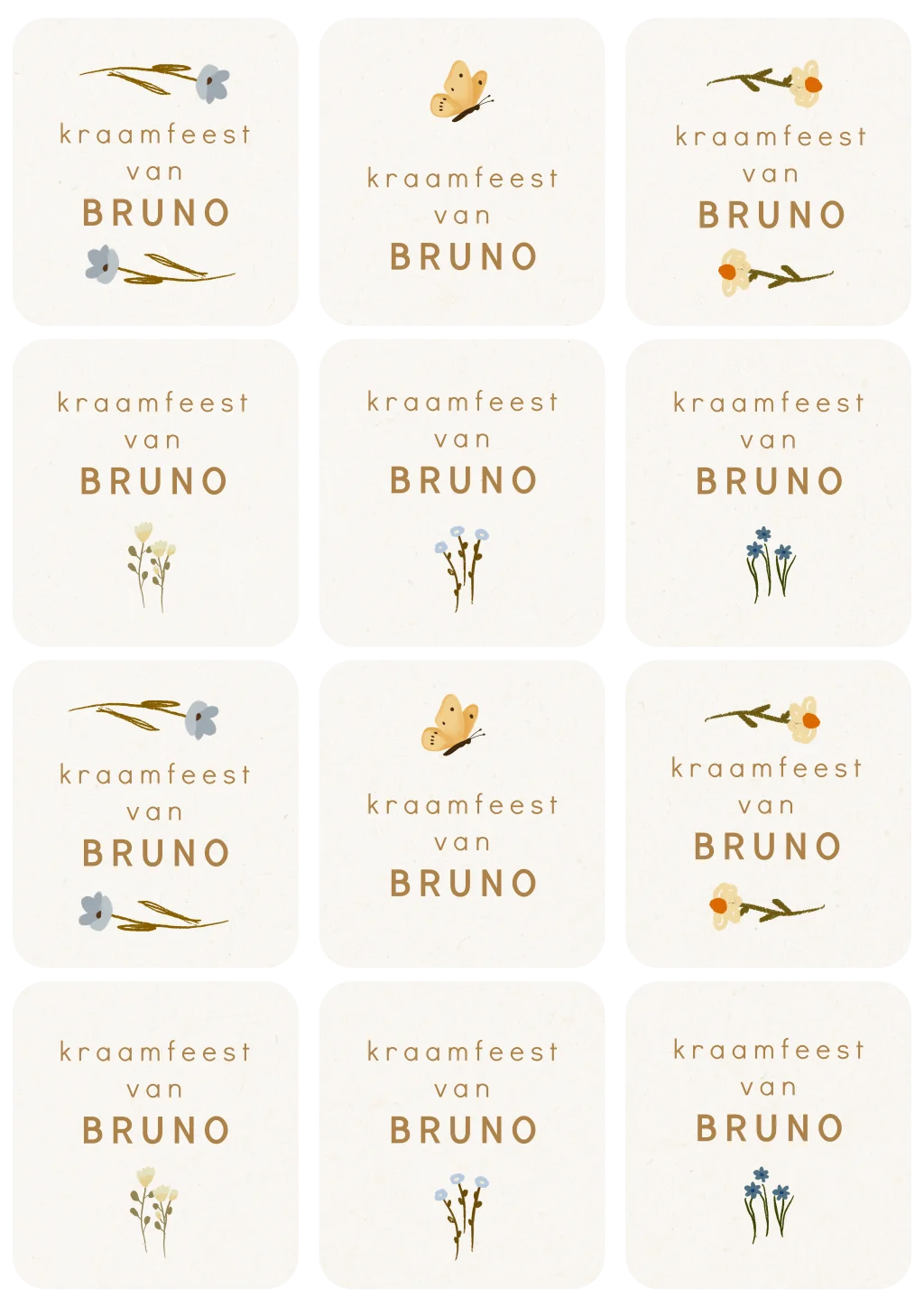 Twaalf kraamborrelkaartjes met blauwe bloemen en een vlindertje.
