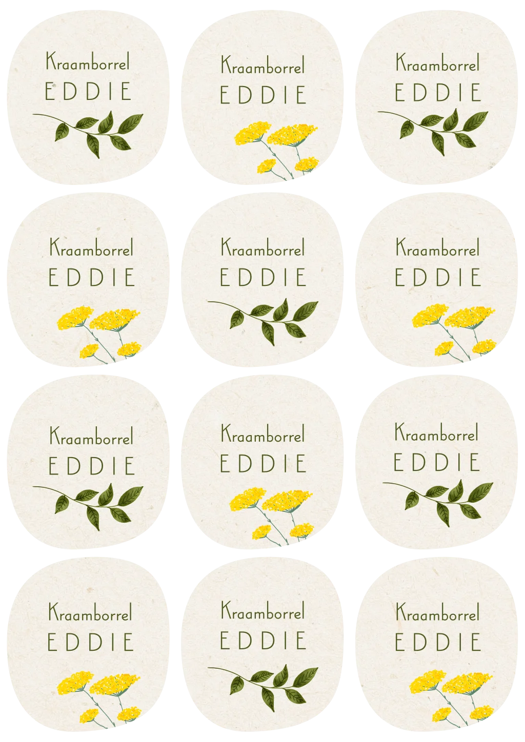 Twaalf kraamborrelkaartjes met bloemen en blaadjes.