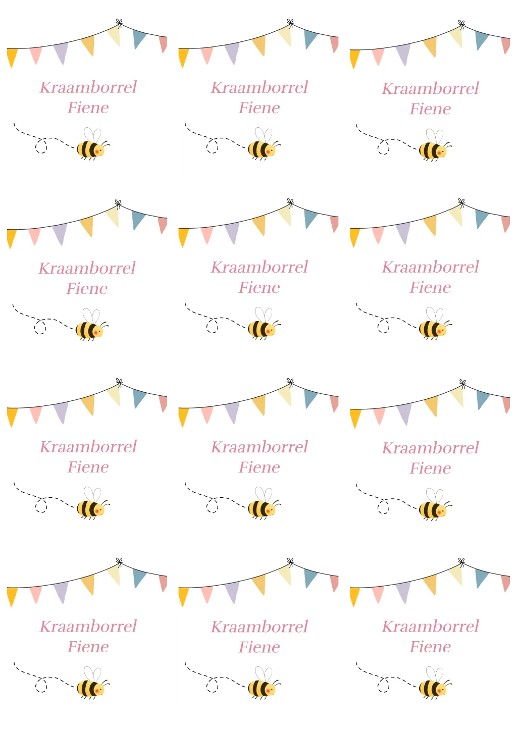 Twaalf kraamborrelkaartjes met vlaggetjes en een vrolijk bijtje.