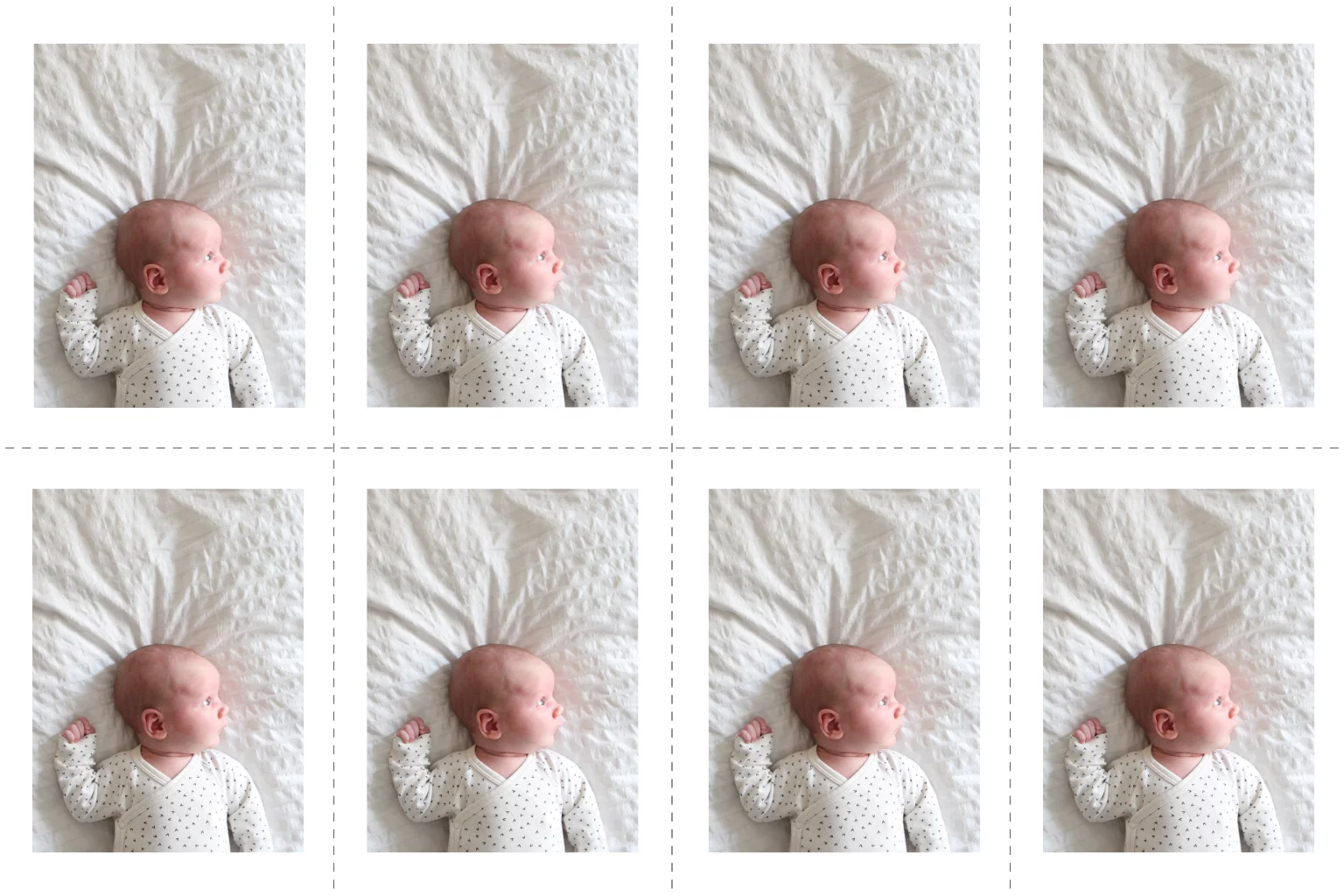 Acht DIY-labeltjes met wit kader voor bij een geboortekaartje