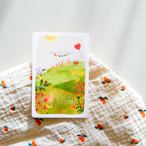 Met zijn levendige kleuren en vrolijke elementen is dit kaartje perfect voor de aankondiging van jullie kleintje. Met een betoverend heuvel landschap, schattige konijntjes, kleurrijke bloemen, vrolijke insecten, feestelijke slingers, een hartvormige ballon, een wiegje en de naam van jullie kindje in het gras, straalt dit kaartje warmte en geluk uit.