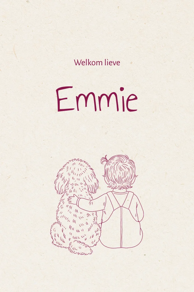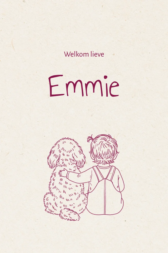 Staand geboortekaartje met een lijntekening van een klein meisje en een hond, een labradoodle.