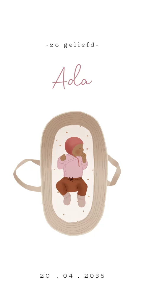 Lief geboortekaartje met een baby in een mandje en ronde hoeken.