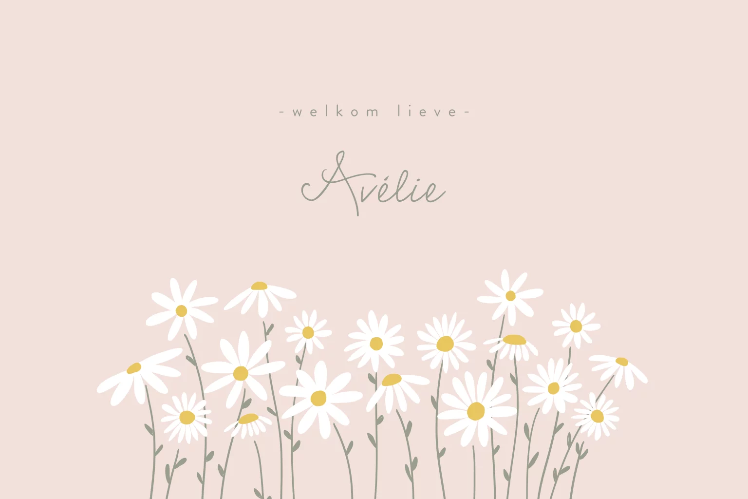 Geboortekaartje met madeliefjes en ronde hoeken. Door de roze achtergrond komen de witte bloemen mooi naar voren.