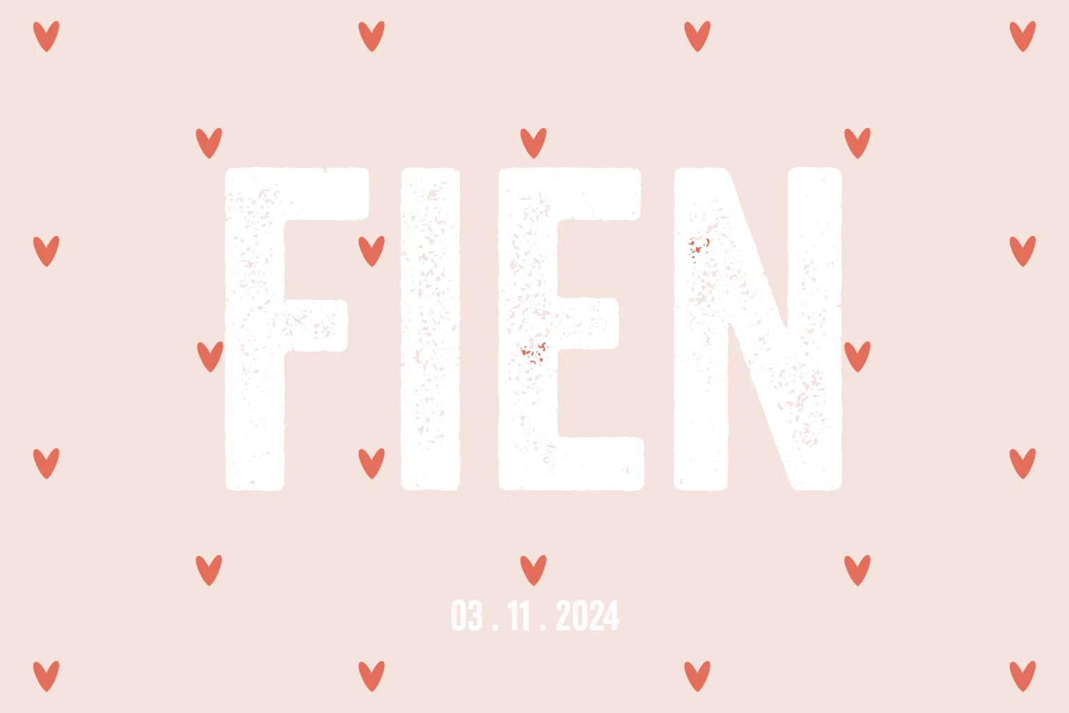 Geboortekaartje met lichtroze achtergrond en zachtrode hartjes. De naam staat in grote stoere letters op de voorkant van het geboortekaartje.