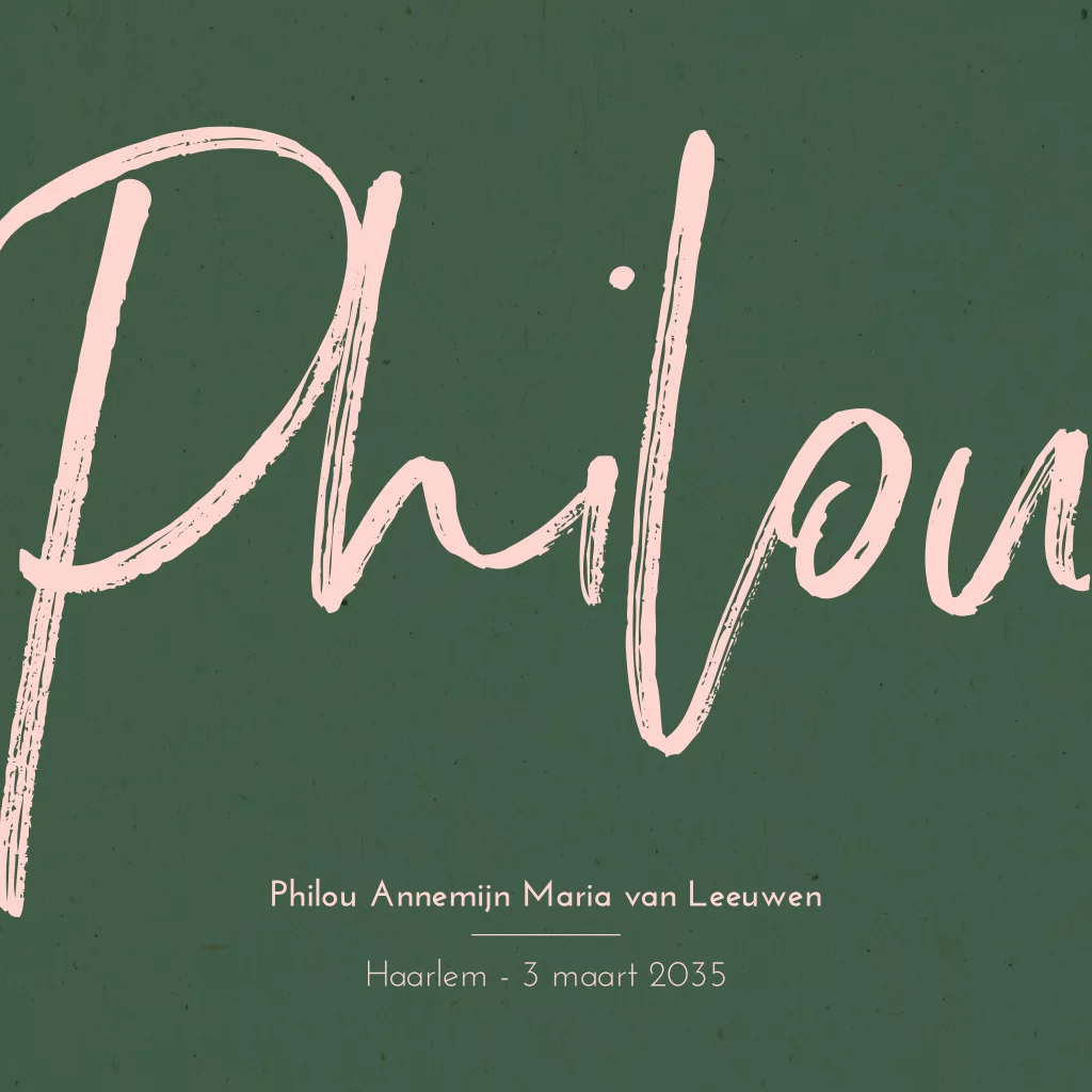 Groen typografisch geboortekaartje met de naam groot op het kaartje
