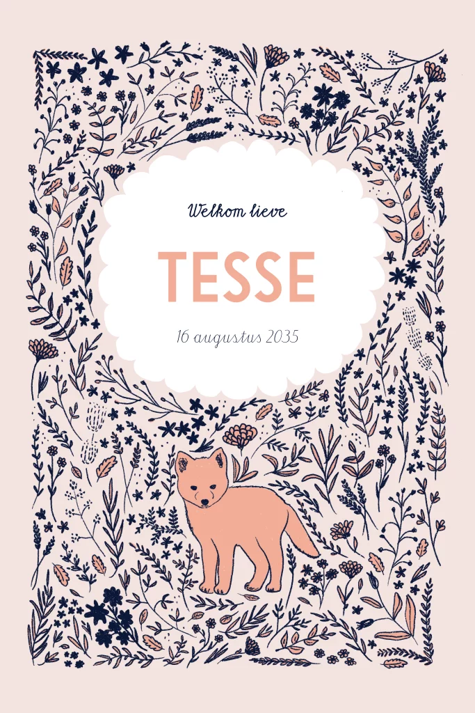 Handgetekend geboortekaartje met takjes, blaadjes en een vosje.