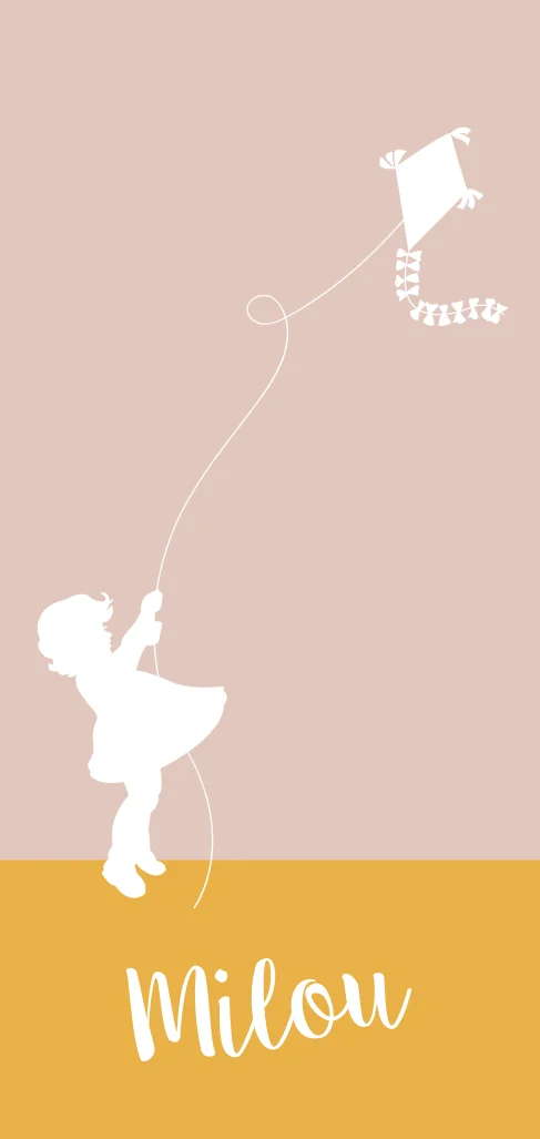 Vrolijk en hip geboortekaartje met een silhouet van een meisje met een vlieger.