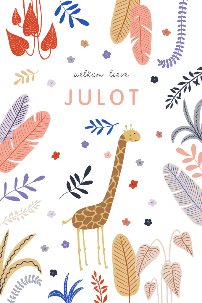Jungle geboortekaartje met een giraf, bloemen en blaadjes met ronde hoeken.