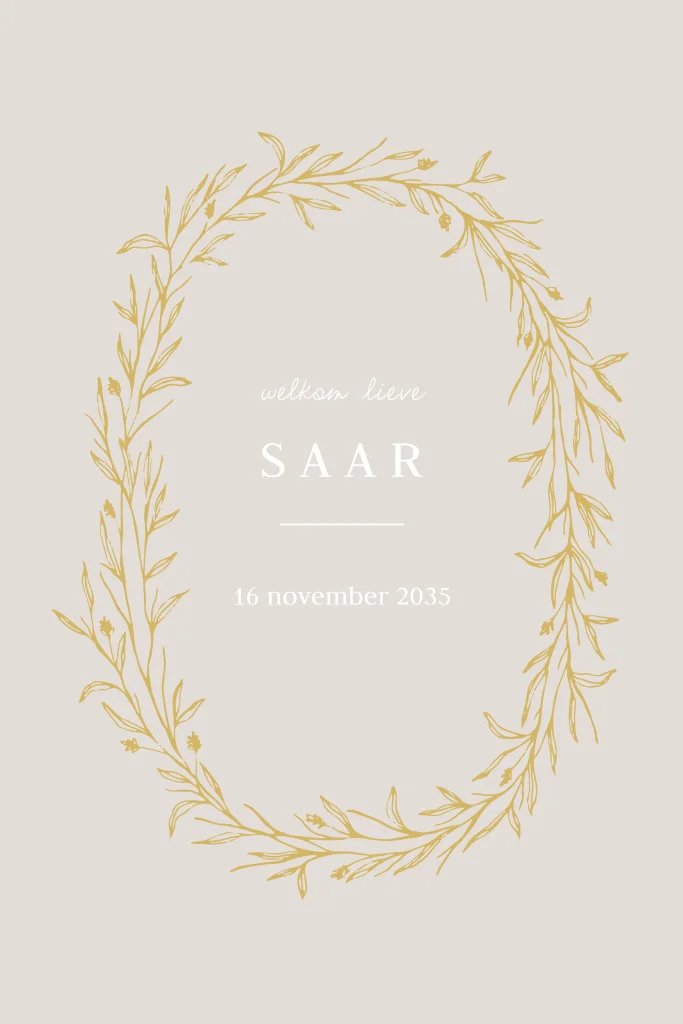Klassiek geboortekaartje met krans van bladeren en beige achtergrond.
