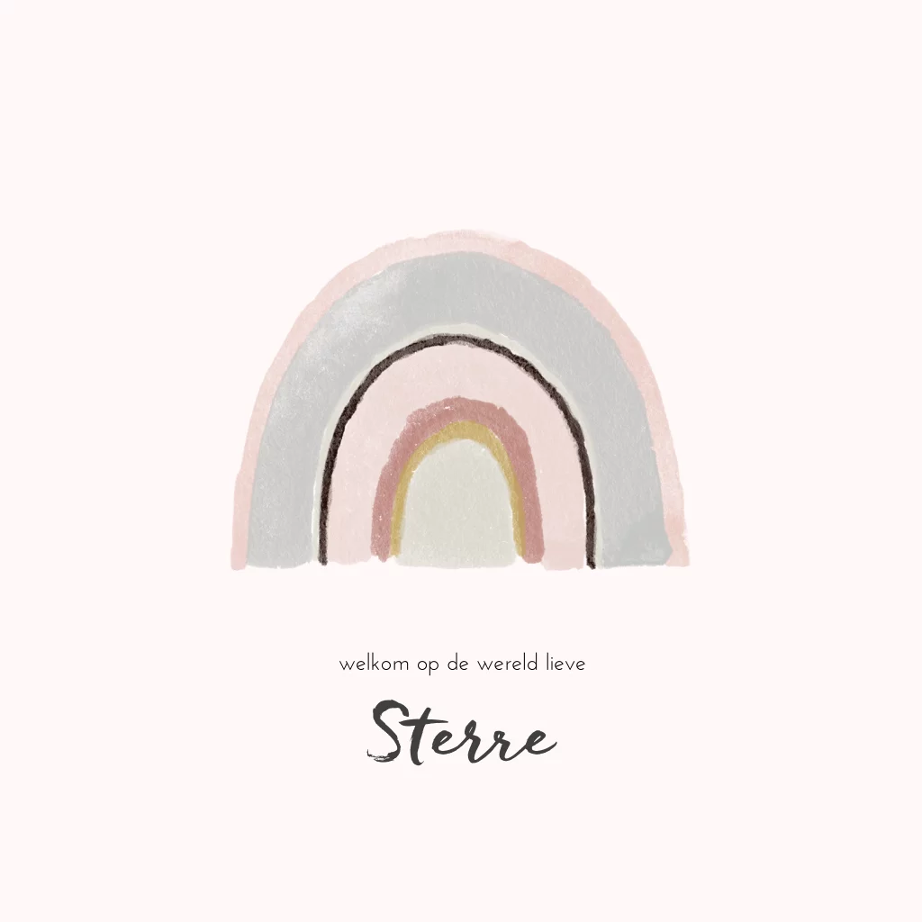Lief en hip geboortekaartje met een geschilderde regenboog.