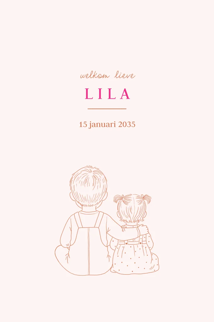 Lief geboortekaartje met een lijntekening van een grote broer en een klein zusje