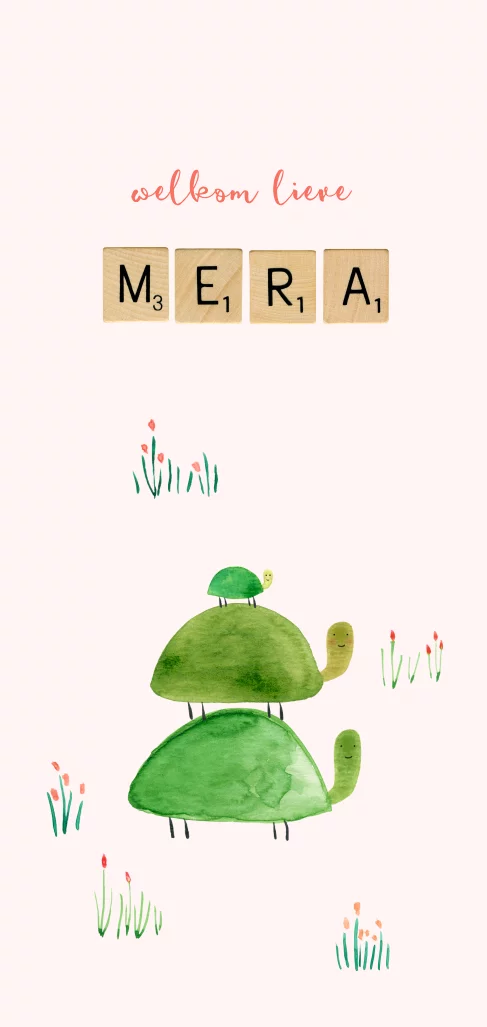 Lief geboortekaartje met familie schildpad en bloemetjes.