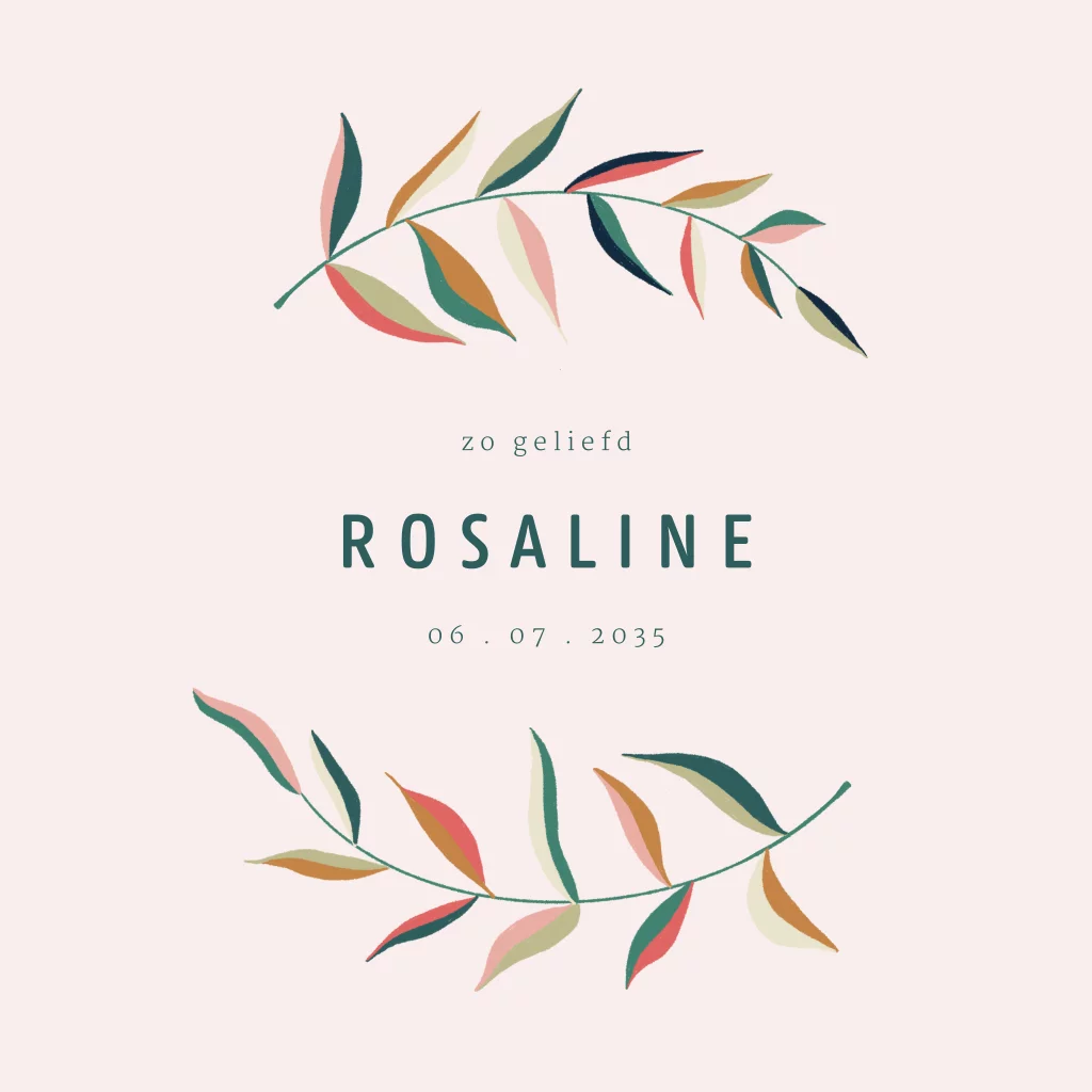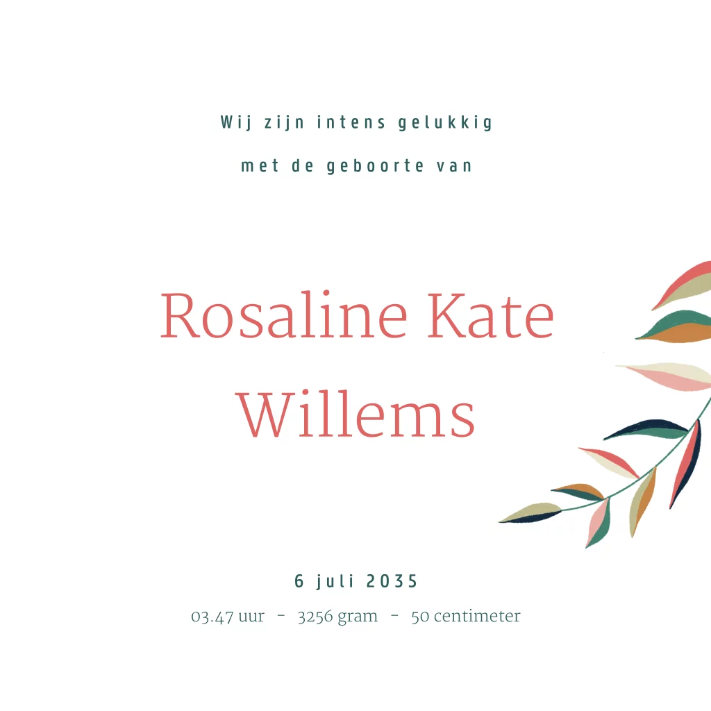 Rustig lief geboortekaartje met takjes en blaadjes in mooie bij elkaar passende kleuren.