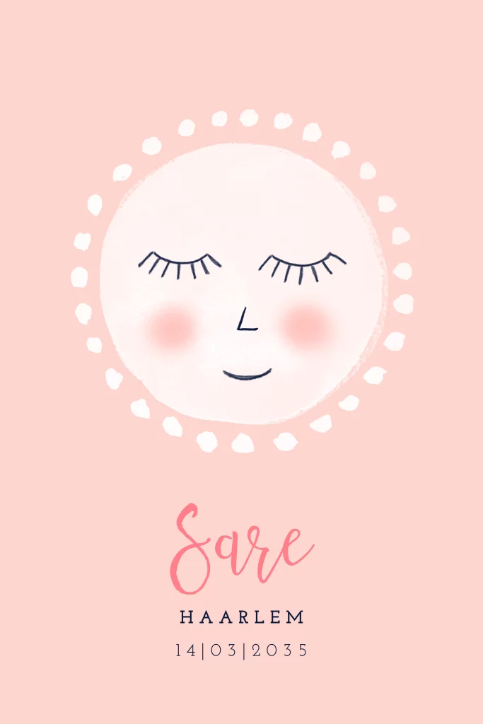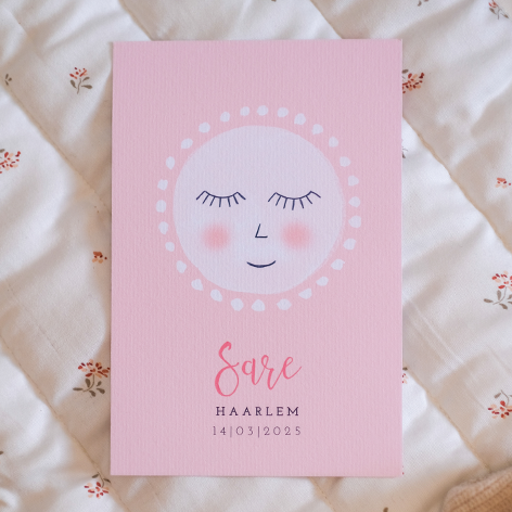 Lief geboortekaartje voor een meisje met een geschilderde zon.