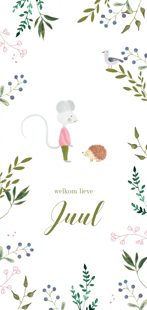 Lief langwerpig geboortekaartje met een muisje, een egel en een meeuw.