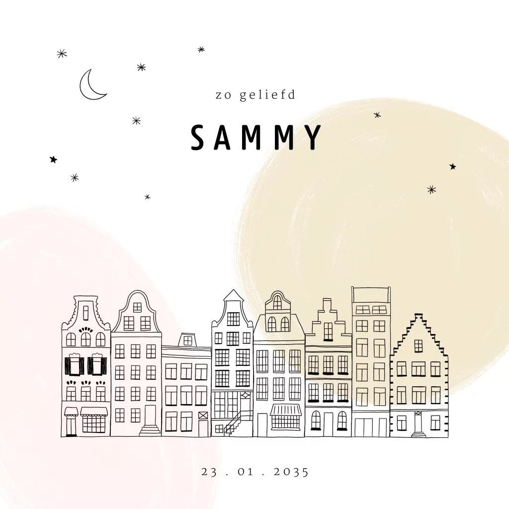 Lief vierkant geboortekaartje met Amsterdamse grachtenpandjes
