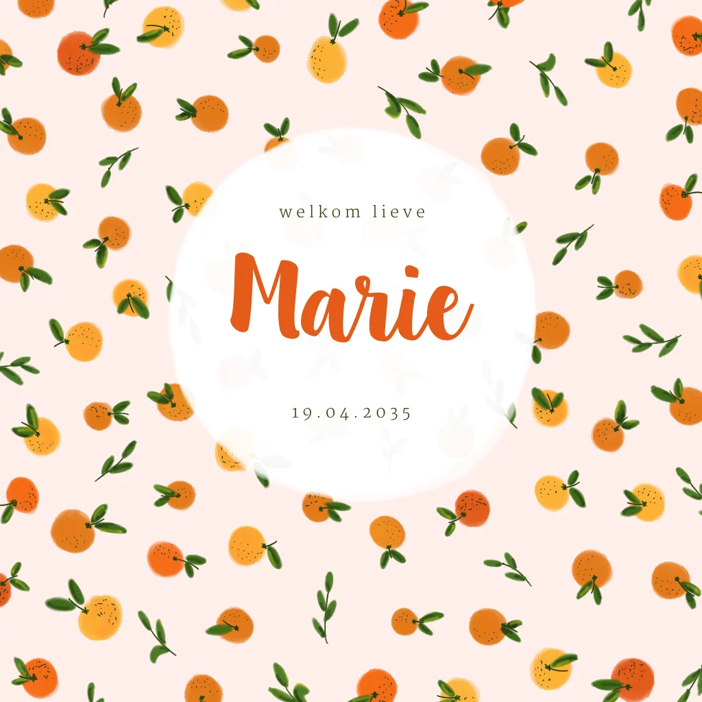 Vrolijk geboortekaartje met sinaasappeltjes en blaadjes.