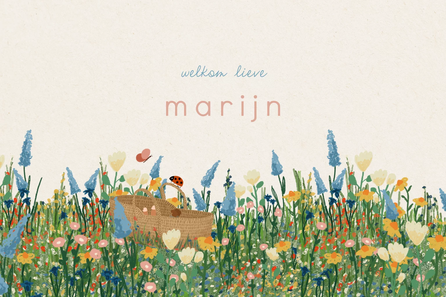 Dit unieke geboortekaartje is een echt eyecatcher. Liggend geboortekaartje met een bloemenveld vol wilde zomer bloemen, een reiswiegje met een baby'tje, een lieveheersbeestje en een vlinder.