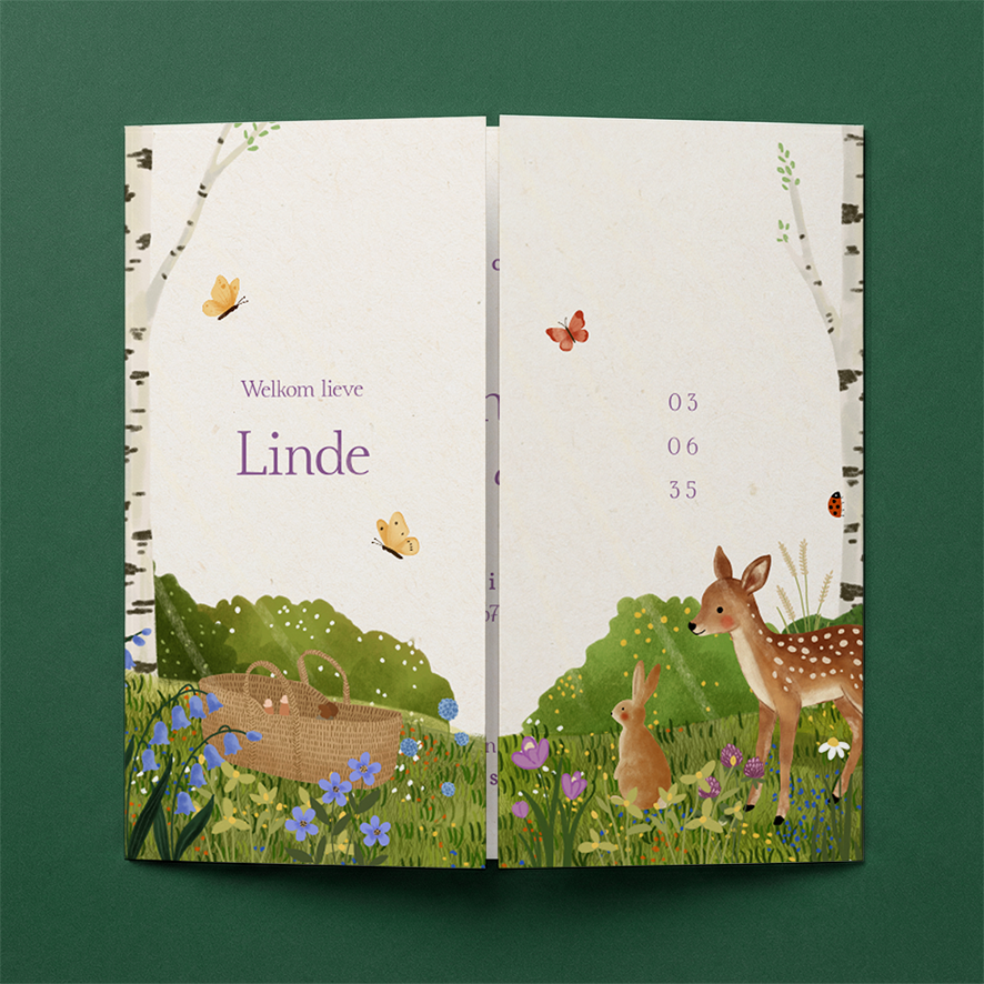 Geboortekaartje met een luikvouw van en open plek in het bos. De zon schijnt, er fladderen vinders door de lucht en er staat een reiswiegje met daarin een lief baby'tje. De dieren komen nieuwsgierig naar het pasgeboren kindje kijken.