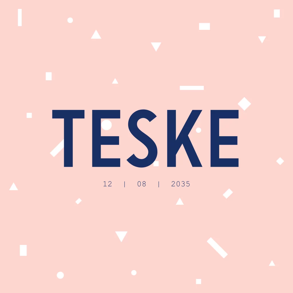 Roze geboortekaartje met witte figuurtjes, blauwe tekst en ronde hoeken.