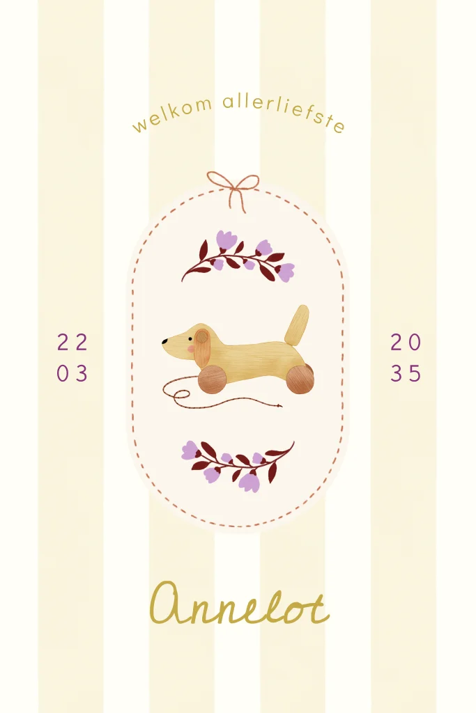 Schattig geboortekaartje met een streepjes achtergrond, een ovalen kader met een strikje er omheen en erin paarse bloemen met een houten speelgoedhondje op wielen..