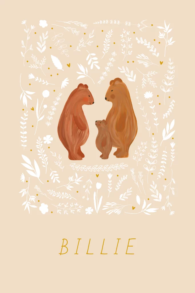 Staand geboortekaartje met beren, bloemen en blaadjes.