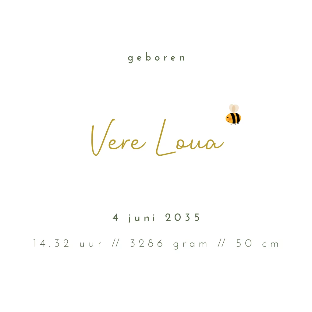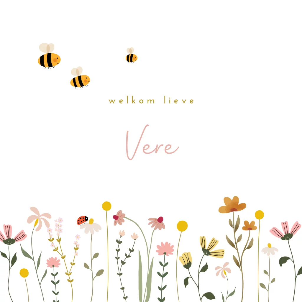 Vierkant geboortekaartje met bloemen, bijtjes en een lieveheersbeestje