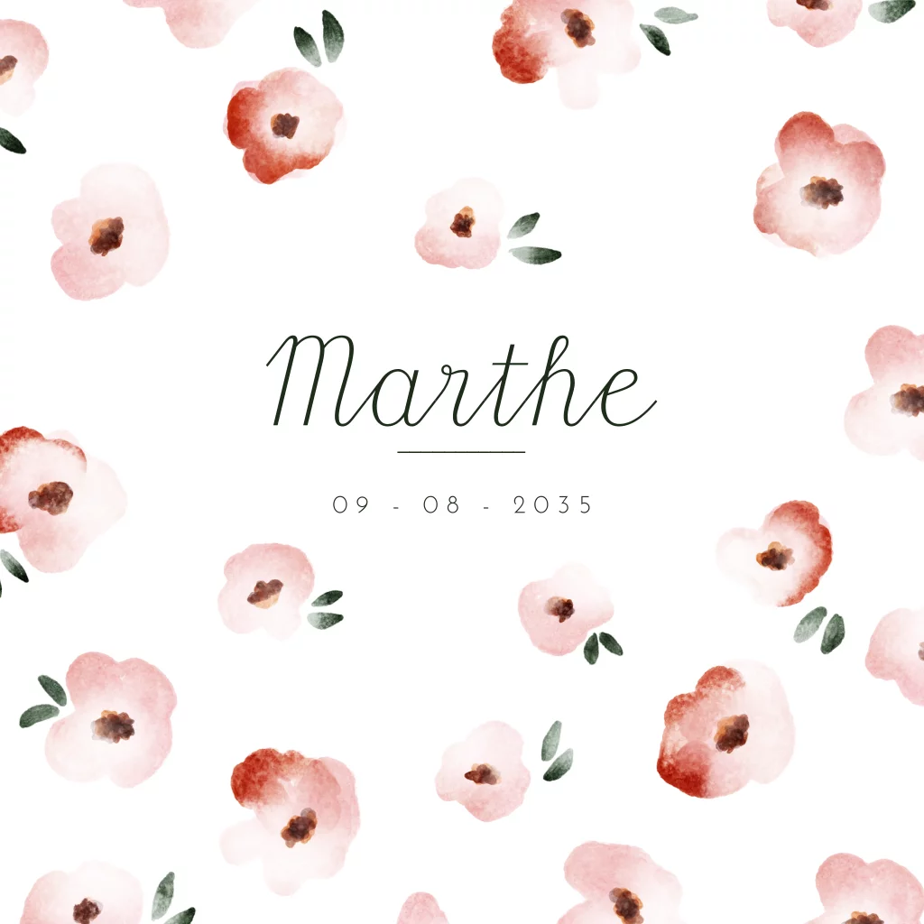 Vierkant geboortekaartje met geschilderde bloemen.