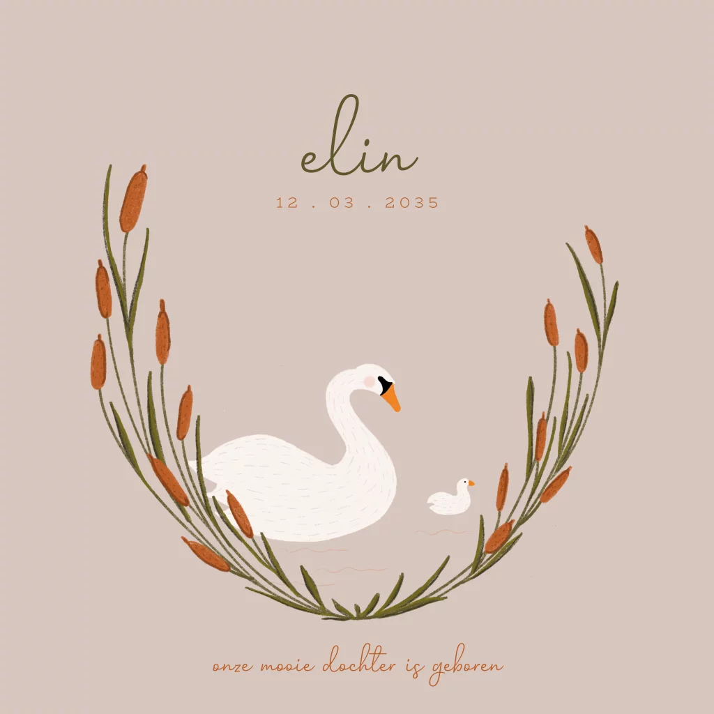 Vierkant geboortekaartje met zwaan en riet
