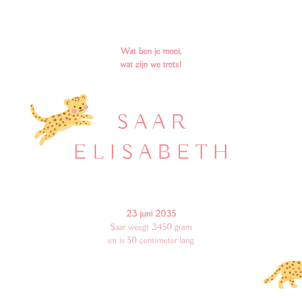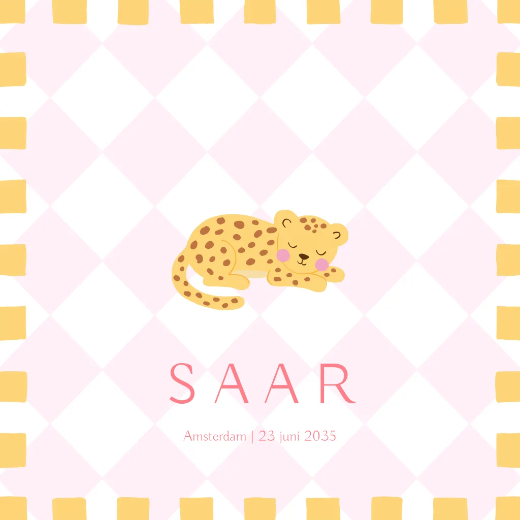 Vierkant gevouwen geboortekaartje met een ruitjes achtergrond, een geblokte rand en pantertjes.
