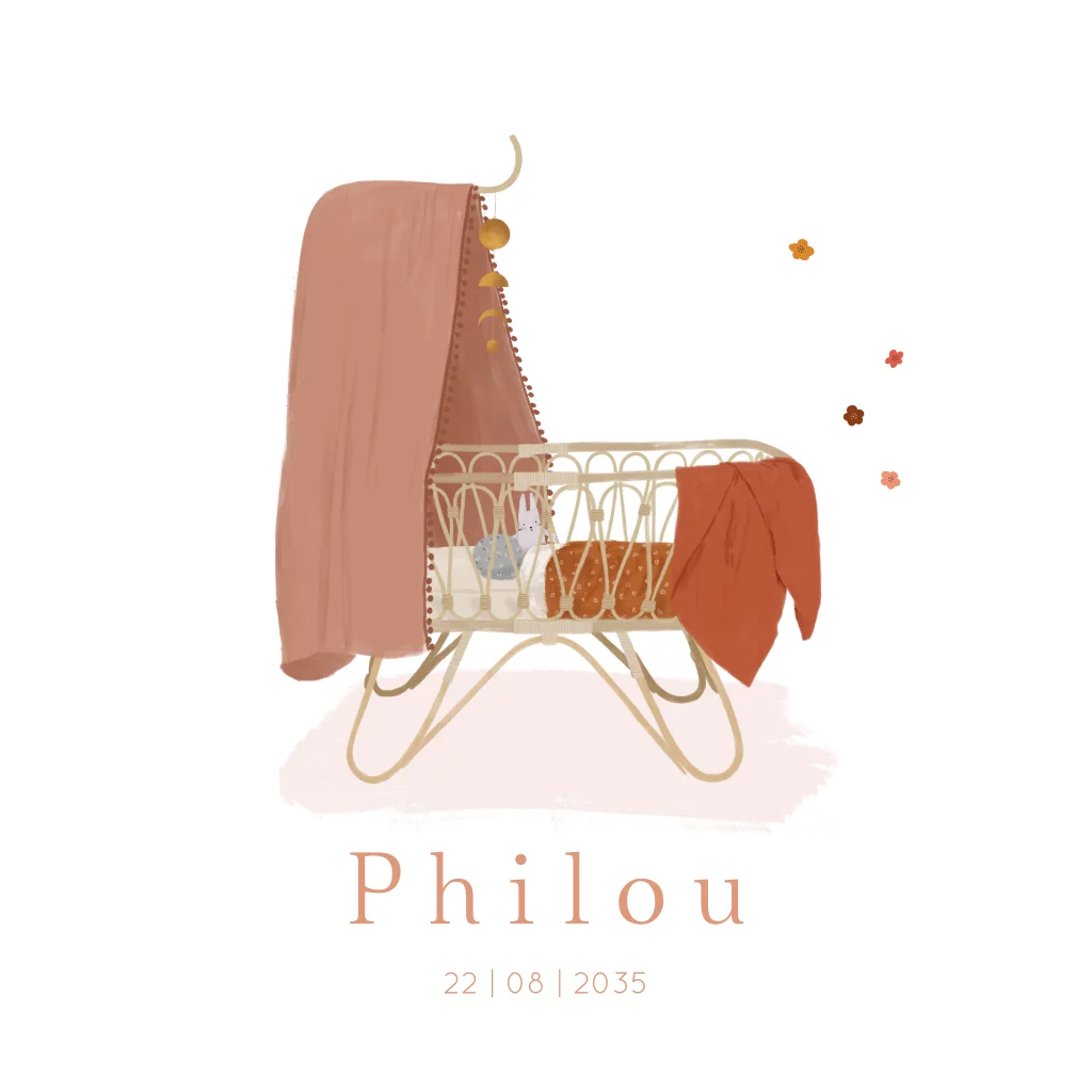 Lief geboortekaartje met een rotan wiegje, en hemeltje, een knuffeltje en bloemen.