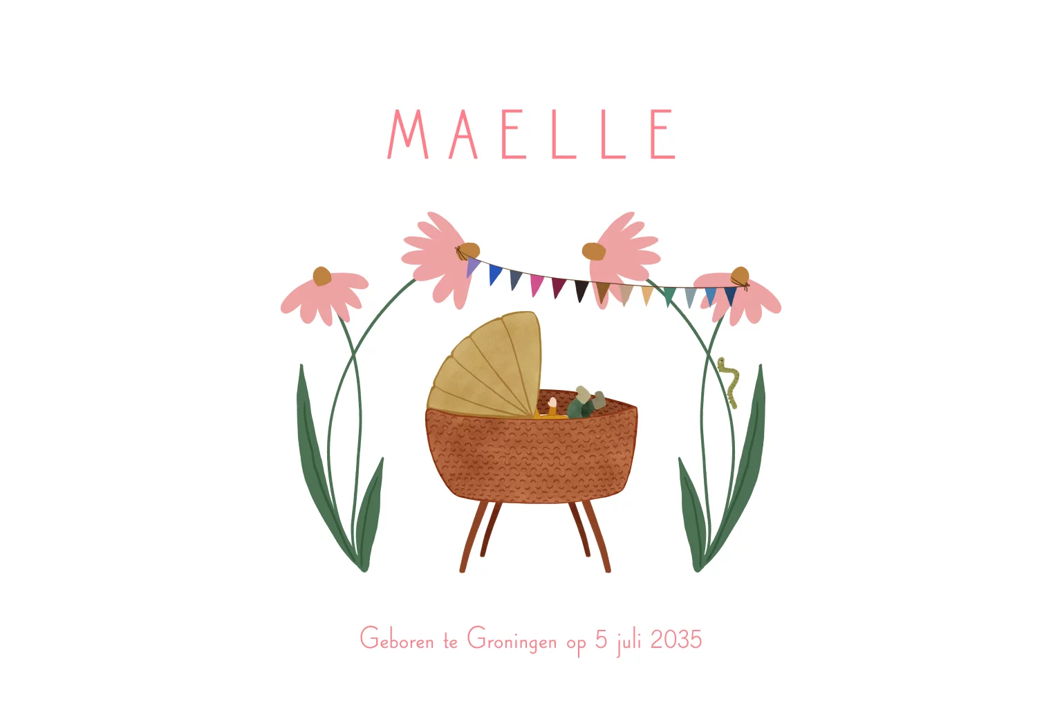 Vrolijk geboortekaartje met grote bloemen, slingers, een rups en een kindje in een wiegje.