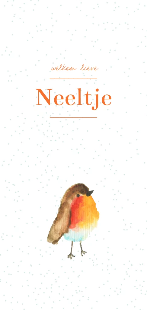 Zoet geboortekaartje met een geschilderd roodborstje, kleine stipjes in de achtergrond en ronde hoeken.
