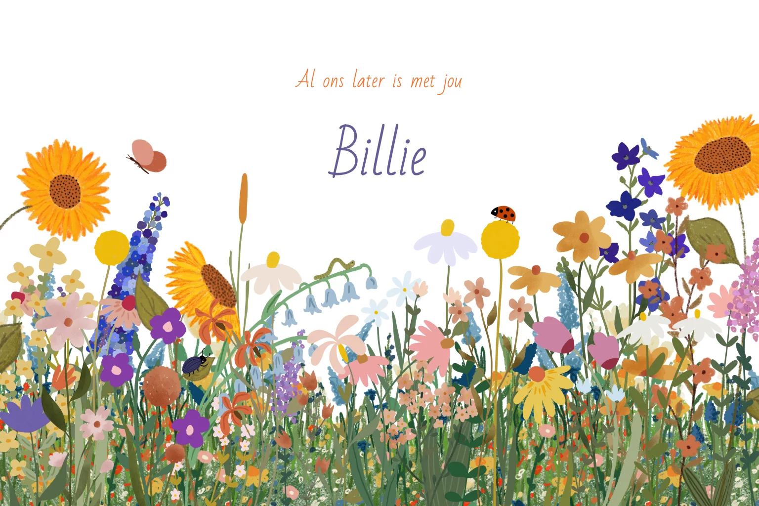 Liggend geboortekaartje - een echt eyecatcher - met een bloemenveld vol wilde zomer bloemen waaronder zonnebloemen en kleine dieren.