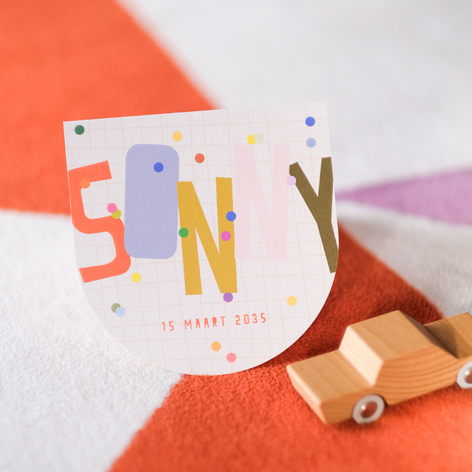 Feestelijk geboortekaartje met een half ronde voorkant en confetti.