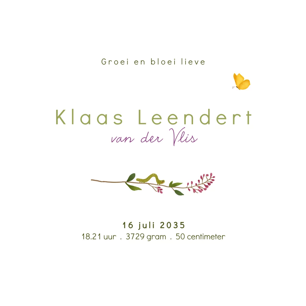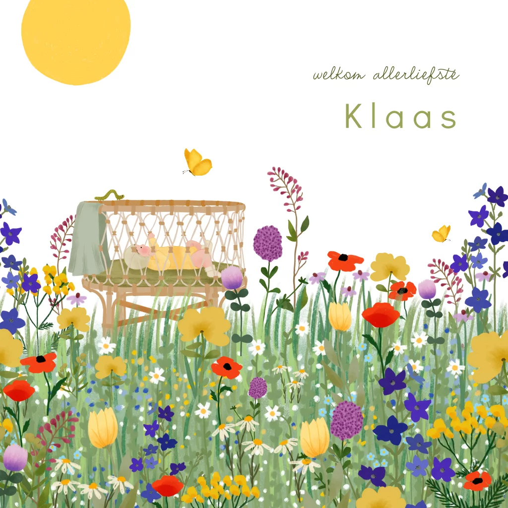 Geboortekaartje met een bloemenveld, een wiegje, rupsje, vlinders en de zon.