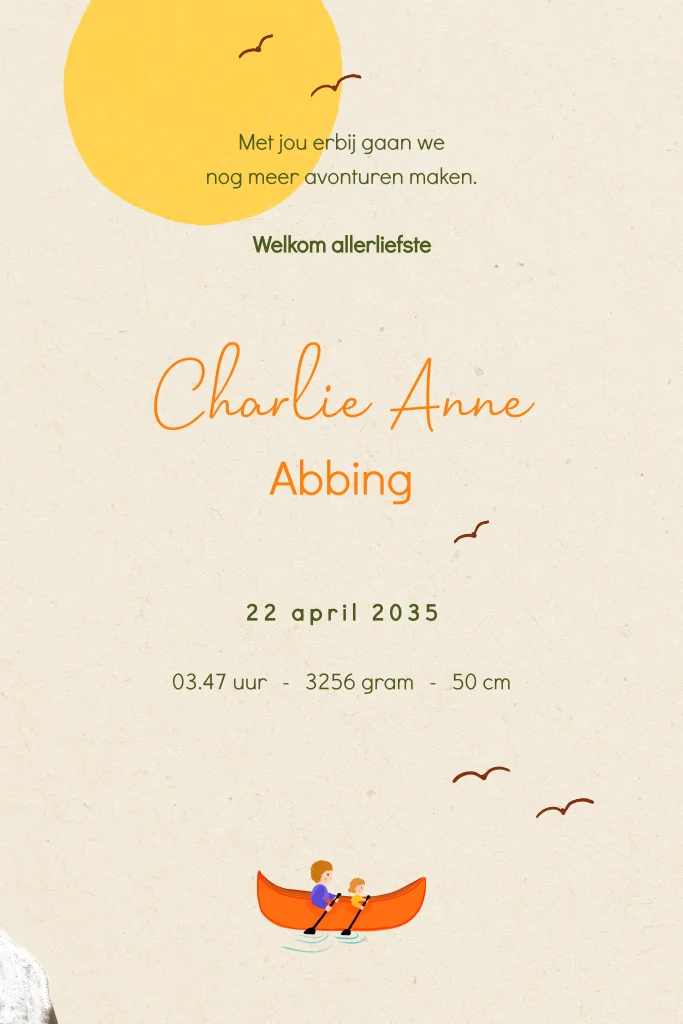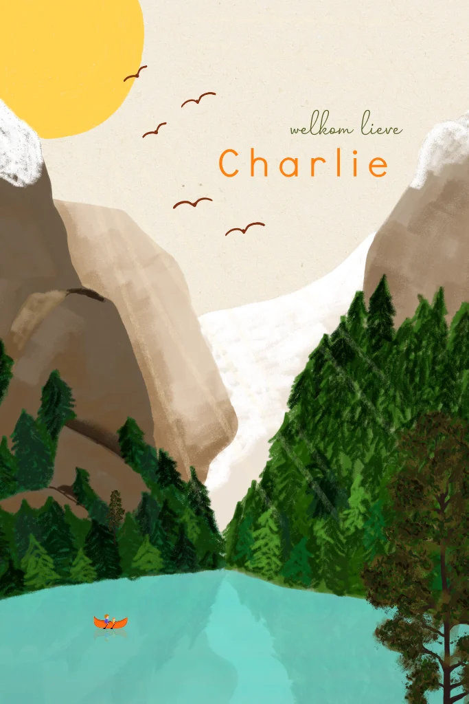 Geboortekaartje met hoge bergen een een blauw meer