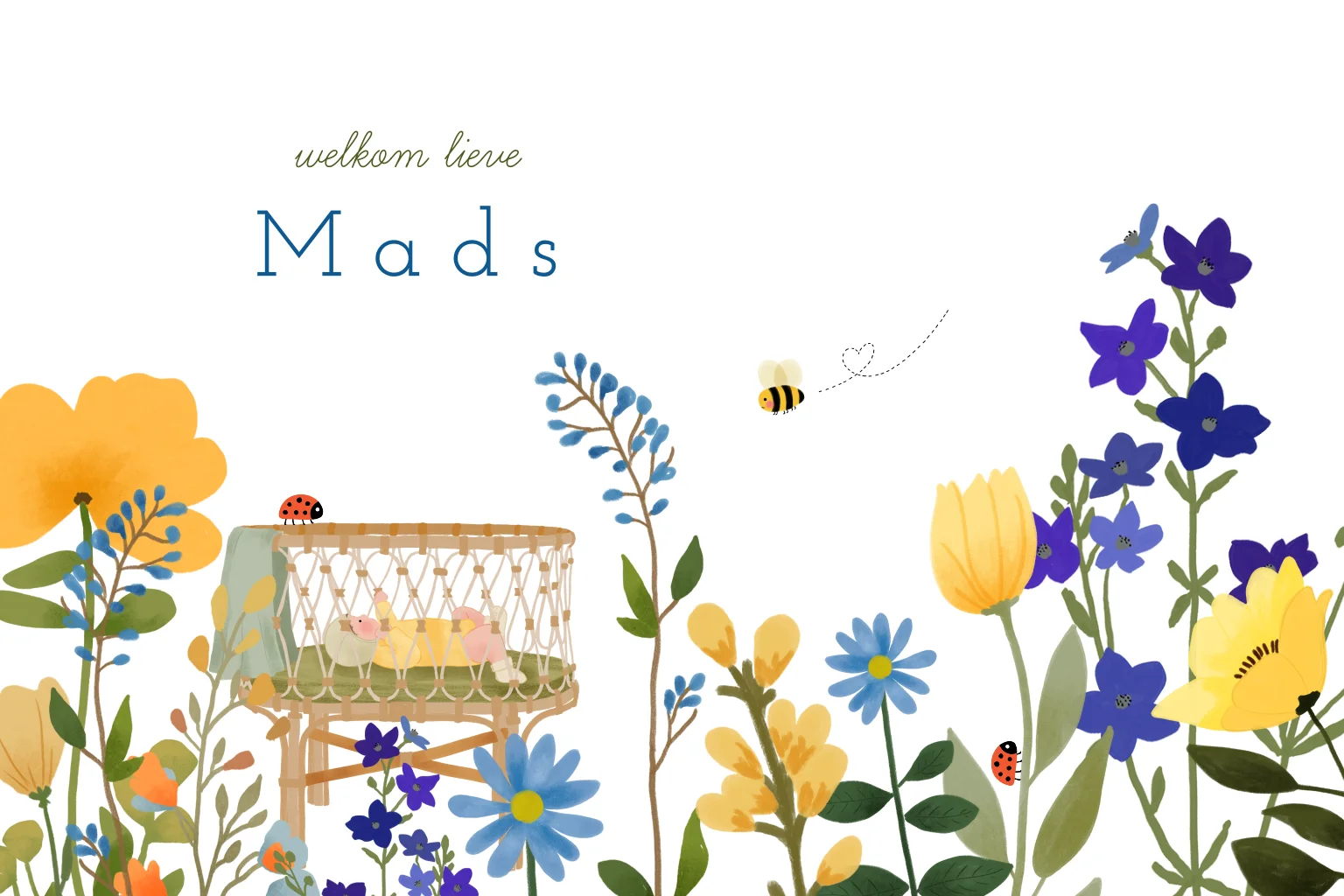 Vrolijk liggend geboortekaartje met een wiegje en bloemen. Dit kaartje heeft ronde hoeken.
