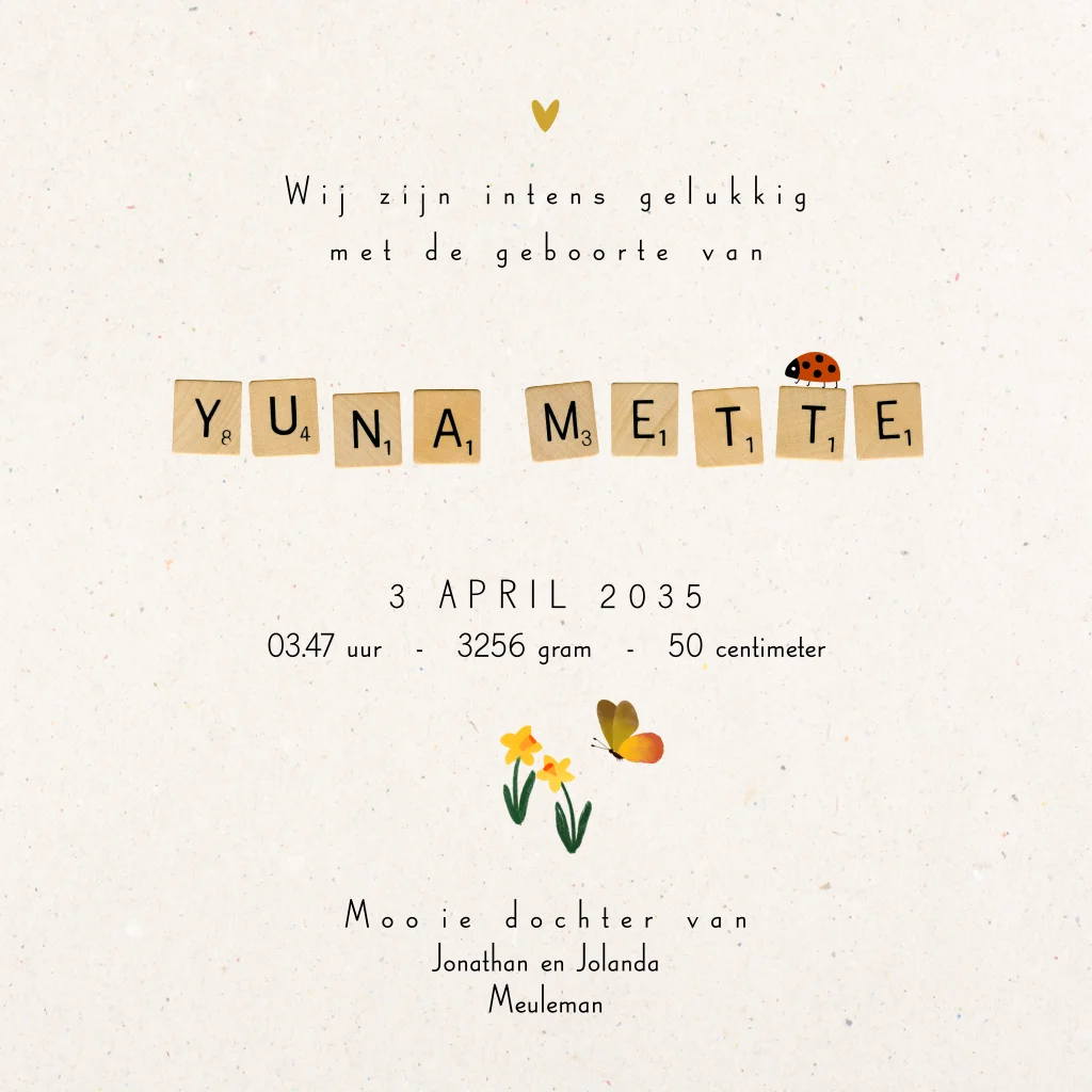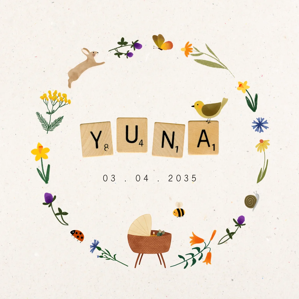 Vierkant gevouwen geboortekaartje met bloemen, een konijntje, slakje, vogeltje, vlinder, lieveheersbeestje, bijtje en een wiegje. De naam staat met scrabble-letters op het kaartje - andere letters kun je vinden in de beeldbank.