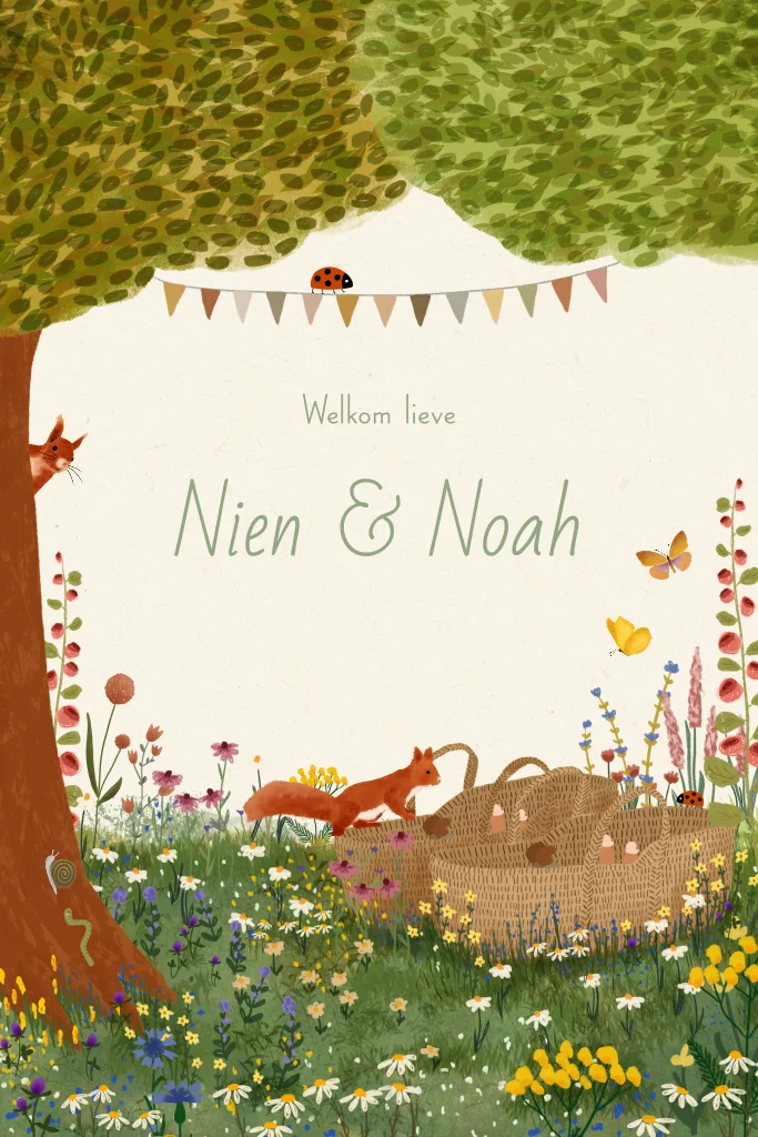 Geboortekaartje met bloemen, dieren en slingers voor een tweeling
