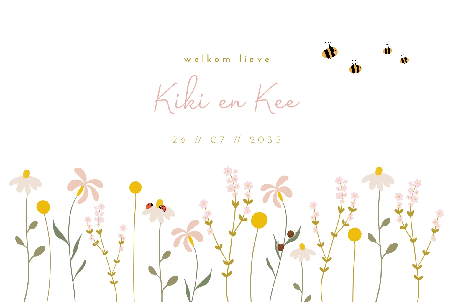 Vrolijk geboortekaartje met bloemen, bijtjes, slakjes en lieveheersbeestjes voor een tweeling. Het kaartje heeft ronde hoeken.