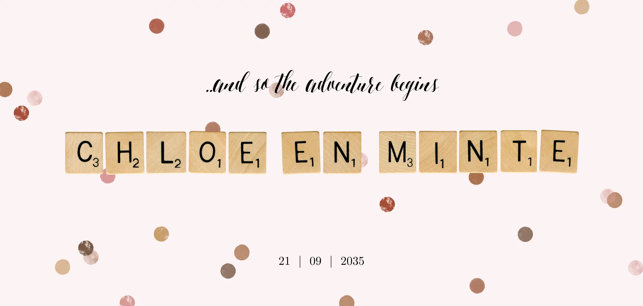 De namen op de voorkant van het geboortekaartje staan in scrabble letters.