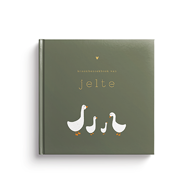 Een kraambezoekboek met donkergroene achtergrond en een familie gans dat perfect past bij jullie geboortekaartje, hoe leuk is dat!